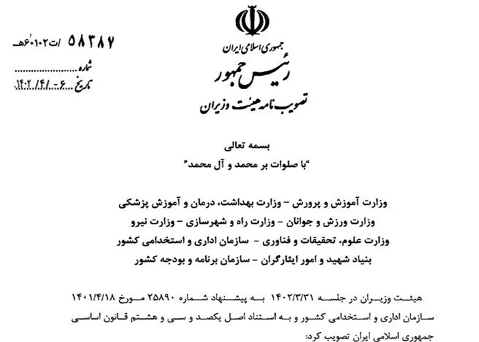 هیئت وزیران در جلسه ۱۴۰۲/۳/۳۱ به پیشنهاد شماره ۲۵۸۹۰ مورخ ۱۴۰۱/۴/۱۸ سازمان اداری و استخدامی کشور و به استناد اصل یکصد و سی و هشتم قانون اساسی جمهوری اسلامی ایران تصویب کرد: