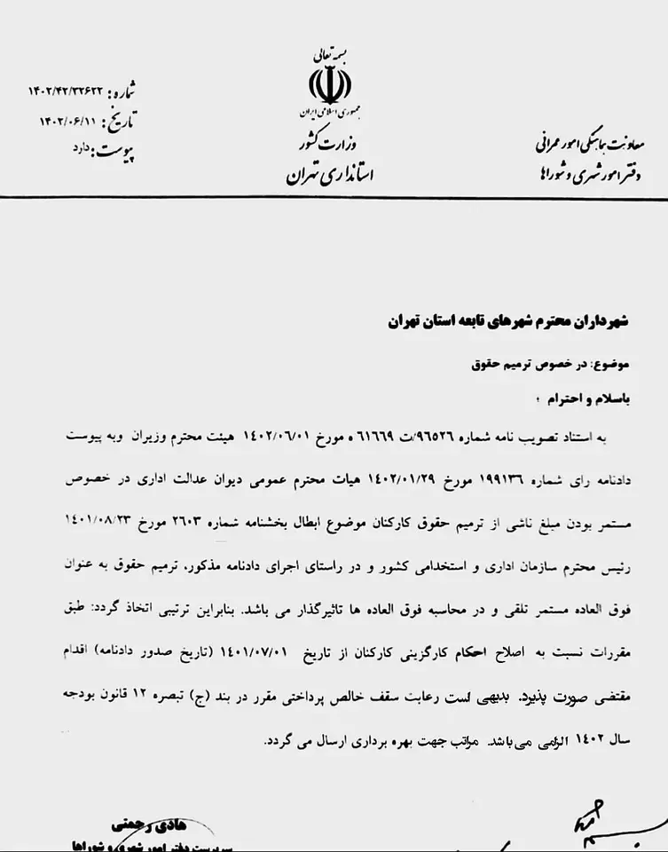 بخشنامه نحوه تاثیر ترمیم حقوق برای کارکنان شهرداری‌ها (بخشنامه شماره ۱۴۰۳/۴۲/۳۲۶۲۲ مورخ ۱۴۰۲/۰۶/۱۱ استانداری تهران)