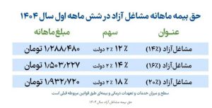 بنابراین، مبالغ حق بیمه مشاغل آزاد سال ۱۴۰۴ به شرح زیر است: